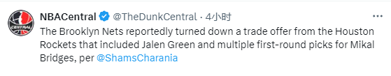 另外值得一提的是,名记shams爆料,火箭曾在2个月前用杰伦-格林和几个首轮签,向篮网报价布里奇斯,最终被篮网拒绝。
