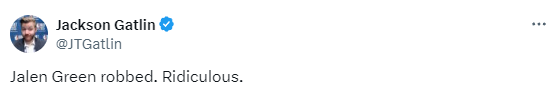 浓眉场均27+16当选西部周最佳,但火箭新星杰伦-格林场均36.3分6篮板且场均命中6记三分却落选引热议,火箭随队记者Coty M. Davis更推感叹:哇,我没想到会是这样,杰伦-格林绝对当之无愧可以获得连续第二周获得周最佳!另一名火箭队记Jackson Gatlin则直言:杰伦-格林被抢劫了,这很荒谬。