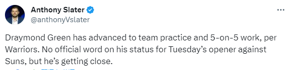 对于格林的情况,勇士记者Anthony Slater表示格林已经参加了全队完整的5对5训练,虽然官方还没公布他的揭幕战出战状态,但他已经接近复出。