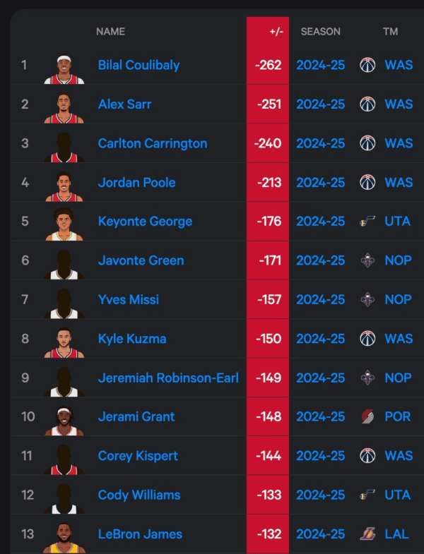 在这份联盟最差正负值榜单上,奇才(东部倒数第一和联盟倒数第一)、爵士(西部倒数第二)、鹈鹕(西部倒数第一)和开拓者(西部倒数第三)四支摆烂球队包揽前十二,奇才四将直接包揽前四;湖人球星詹姆斯榜上有名,本赛季正负值累计为-132,为全队最差以及联盟第13差。