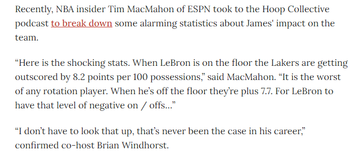对此,名记Tim MacMahon表示糟糕的数据更能证明湖人球星的衰落,在节目中称:这是令人震惊的数据。当勒布朗在场上的时候,湖人每百回合输8.2分,他是所有轮换球员中最糟糕的。当他下场时,他们百回合赢7.7分。对于勒布朗来说,他的正负值拖累了球队。