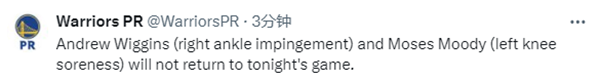除了维金斯之外,勇士官方也宣布穆迪因左膝酸痛也退出比赛,今日穆迪仅仅替补登场6分钟,2投1中拿到3分1篮板。