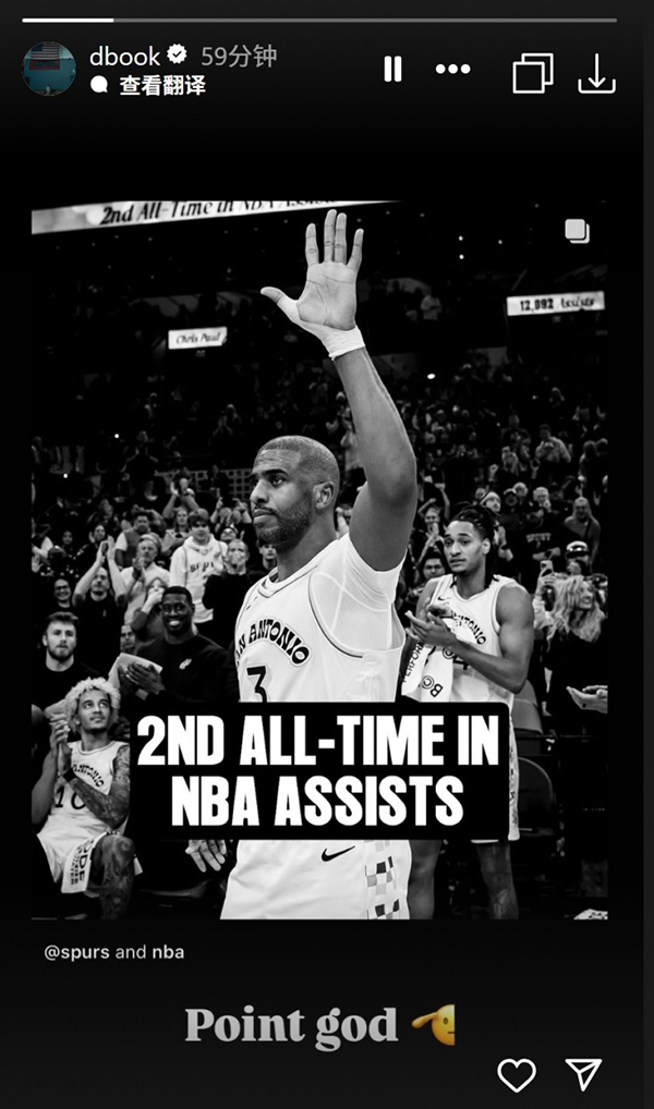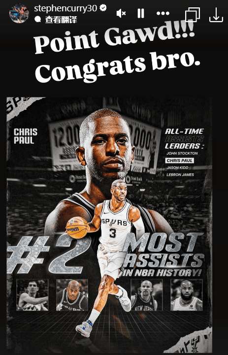 勇士球星库里在Ins上送上祝贺,他写道:控卫之神!恭喜兄弟;太阳球星布克和雷霆球星亚历山大也转发保罗创纪录的海报,配文写道:控卫之神。