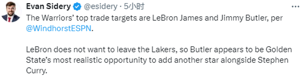 Evan Sidery表示,勇士队的首要交易目标是勒布朗-詹姆斯和吉米-巴特勒; 勒布朗不想离开湖人队,因此巴特勒似乎是金州勇士队除了库里之外再增加一位球星的最现实机会。