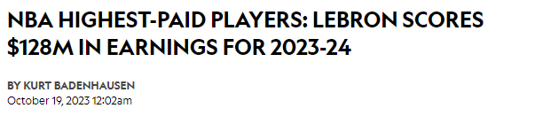 38岁的詹姆斯不仅仍旧是联盟超巨之一,而且仍旧是联盟吸金王,据此前统计,詹姆斯2023年总收入达到1.2亿美元,排在NBA第一位,排在世界运动员收入榜第四位。