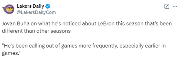 今日湖人跟队记者Jovan Buha谈到了本赛季詹姆斯与其他赛季的不同之处 ,Buha表示:他在比赛中要求下场休息的次数越来越多了,尤其是在比赛早期。