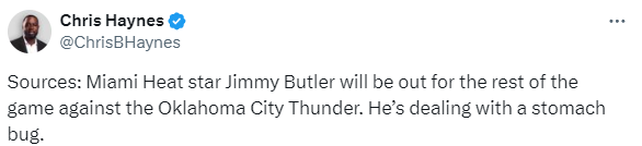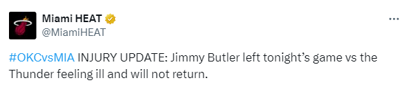 第一节4分多钟,巴特勒在与多尔特争夺球权时意外崴脚,受伤后一瘸一拐走到替补席,随后离场返回更衣室;之后热火官方宣布巴特勒因身体不适而退出比赛,名记克里斯-海耶斯进一步报道,巴特勒是因胃部不适而退赛,正在治疗胃病。