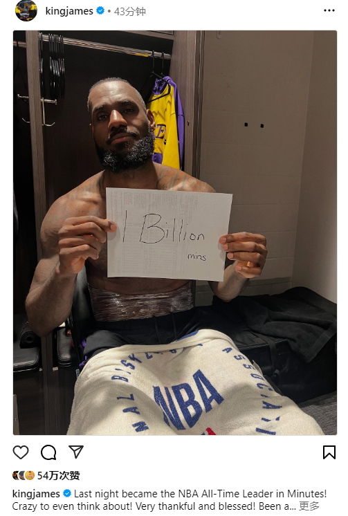 今日詹姆斯更新Ins晒出自己在更衣室举着写有“10亿分钟”的恶搞照,配文写道:昨天成为了NBA有史以来出场时间最多的球员!想到这一点就疯狂!非常感激和幸运拥有这一段精彩非凡的旅程,张伯伦风采式的10亿分钟(笑哭表情)。