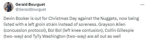 来源:JRS直播网12-25 11:38牛叉NBA录像网讯 北京时间12月25日,太阳官方公布年终大战伤情,布克(腹股沟)、格雷森-阿伦(脑震荡协议)和波尔-波尔(膝盖)都因伤确定缺战掘金;布克继续伤停,杜兰特和比尔再次带队大战掘金,其中比尔深陷交易流言之中。