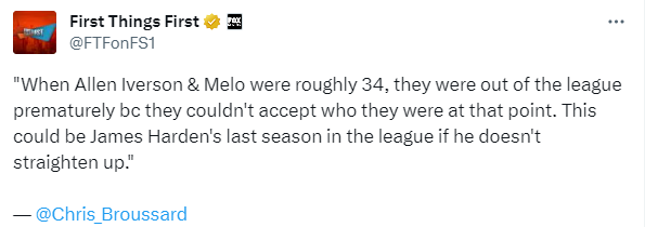 名嘴Chris Broussard表示,当艾弗森和甜瓜大约 34 岁时,他们过早地退出了联盟,因为他们无法接受当时的自己。如果詹姆斯-哈登不振作起来,这可能是他在联盟的最后一个赛季。