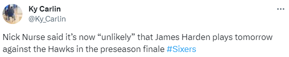 根据赛程,76人将在明天上午7点对阵老鹰,这是费城的最后一场季前赛;此前哈登曾表示他计划出战与老鹰的季前赛,可如今哈登再次逼宫离队,归队出战的可能性不大。