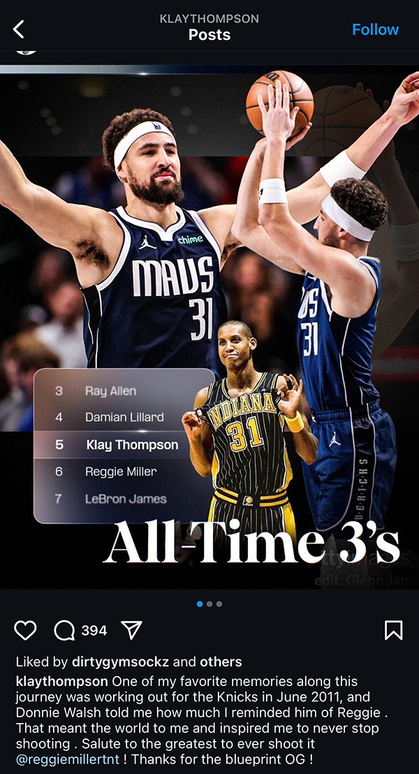 今日克莱更新Ins,晒照纪念超越偶像米勒升到历史三分榜第5位,配文写道:这一路以来我最爱的回忆就是2011年为尼克斯试训,唐尼-沃尔什(时任尼克斯总经理)跟我说我有多像雷吉-米勒。这对我来说意味着全世界,激励我永不停止去投篮。向历史最佳射手@雷吉-米勒致敬!谢谢你为后辈们树立的榜样,老炮!