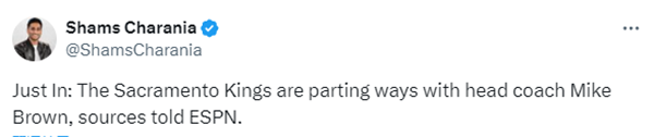 国王已经解雇了主教练迈克-布朗,布朗国王生涯的执教战绩为107胜88负;助教道格-克里斯蒂预计将担任国王临时主教练;道格-克里斯蒂今年54岁,球员时期曾于2000-2005年为国王效力,退役后在NBA担任了15个赛季的助教,从21-22赛季开始担任国王助教。