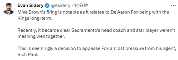 迈克-布朗下课引热议,Evan Sidery表示布朗下课与福克斯长久效力国王有关,最近布朗和球星球员之间的配合不太好,这似乎是国王在经纪人里奇-保罗的压力下为了安抚福克斯而做出的决定。