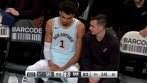 第三节文班亚马迎来爆发,中路接球后杀到内线双手暴扣,外线接连轰进3记三分球,文班突然暴走并且带队拉开分差,不过这一节4分40多秒,文班抢篮板时被威尔逊撞到头部,文班捂着面部痛苦倒地,之后返回更衣室接受检查,所幸身体无碍,并且回到替补席。