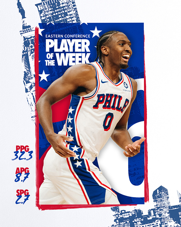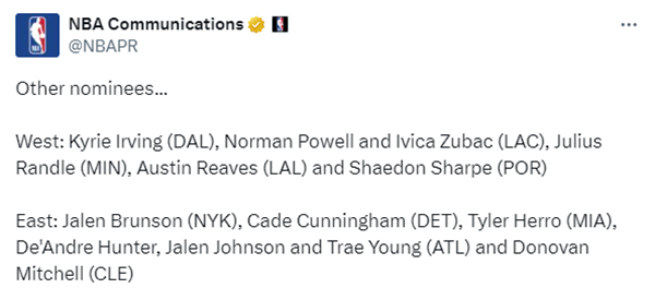 来源:JRS直播网12-31 18:18JRS直播网讯北京时间12月31日,NBA官方公布本赛季第10周东西部周最佳球员,76人球星马克西和雷霆球星亚历山大当选,两人都是场均30+当选,欧文、布伦森、里夫斯等人获提名。