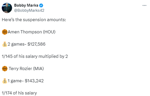 NBA薪资专家Bobby Marks跟进报道,阿门-汤普森禁赛2场损失127586美元的薪水,罗齐尔禁赛一场损失143242美元的薪水。