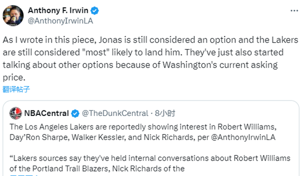 据悉奇才对湖人的报价不满意,奇才正在四处探索,想要一份比湖人的更好的报价,但并没有更好的报价,湖人记者Anthony Irwin报道,目前湖人仍被视为最可能得到瓦兰。