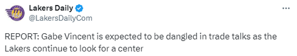 此前湖人与篮网完成一笔5换2大交易,湖人把拉塞尔、刘易斯和三次次轮签送到篮网,得到芬尼-史密斯和谢克-米尔顿;今日Michael Scotto撰文报道,湖人队的下一个目标是替补中锋,消息人士透露,湖人将继续尝试用次轮签追求奇才队中锋瓦兰丘纳斯或者另外一名替补中锋,预计文森特会成为谈判筹码。