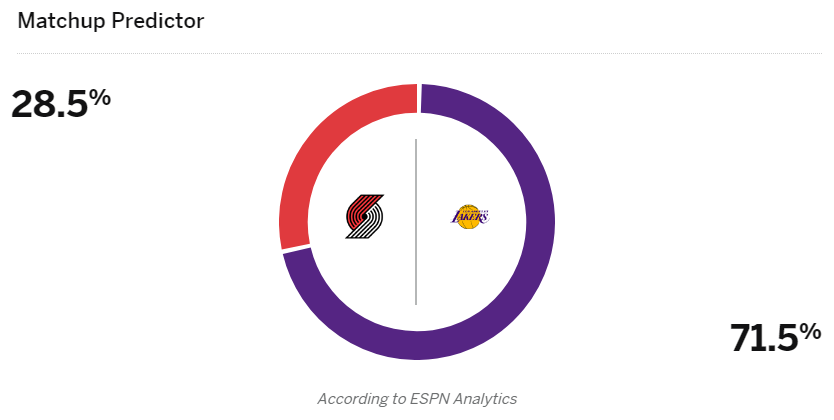 目前湖人18胜14负排在西部第7位,开拓者则是11胜21负排在西部第13位,对于本场比赛,ESPN预测湖人赢球概率高达71.5%,开拓者赢球概率为28.5%,换言之,美媒看好湖人主场击败开拓者。