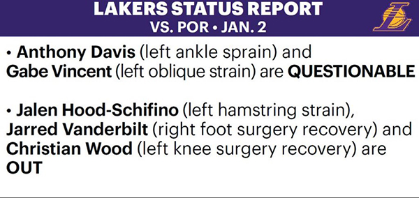 湖人官方已经公布下一场对阵开拓者的伤病报告——