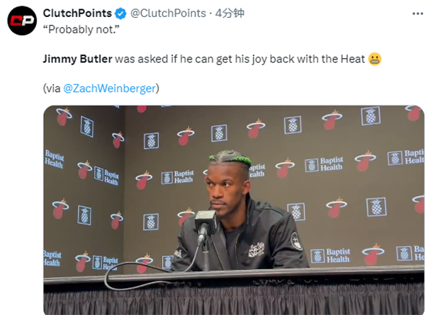而当记者提到能否继续在热火找回打球乐趣的问题时,巴特勒回答:也许不会了。