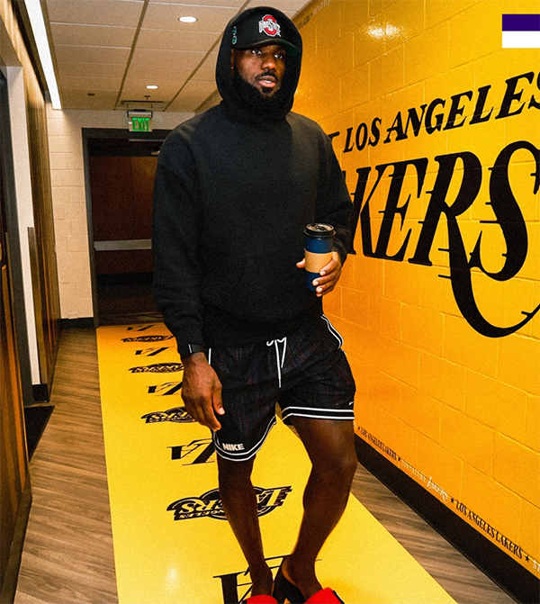 上一次击败开拓者,詹姆斯因伤休战;今日主场再战开拓者,浓眉(左脚踝扭伤)因伤缺席比赛,詹姆斯继续首发带队;赛前詹姆斯身穿短裤拖鞋,搭配连帽卫衣帅气入场。