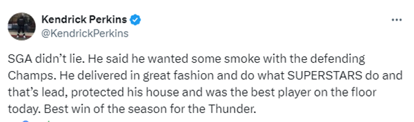 过去的两场比赛,雷霆末节拿到66分,只让尼克斯和凯尔特人拿到31分;雷霆15连胜引热议,名嘴帕金斯发推写道:SGA没有撒谎。他说他想和卫冕冠军一较高下,他表现得非常出色,做了超级巨星该做的事,那就是领导球队,保护自己的主场,成为今天场上最好的球员,这是雷霆队本赛季最好的胜利。