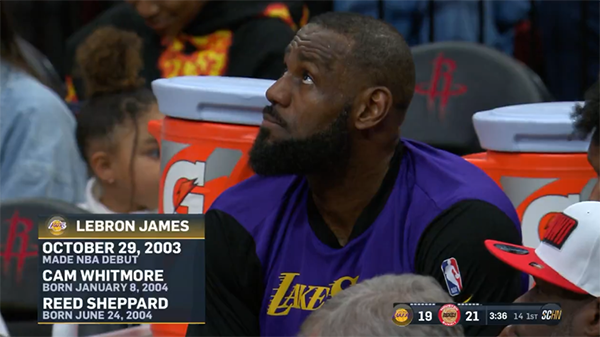 第一节湖人开场和火箭打得十分胶着,可是19-18之后湖人进攻断电,被火箭打出18-3的进攻高潮,首节打完湖人22-36落后14分;老詹首节2投1中拿到2分4篮板2助攻,期间詹姆斯想造犯规却被杰伦-格林撞翻,吃到防守犯规还赔上2+1;浓眉6中1拿到2分2篮板2助攻3盖帽。