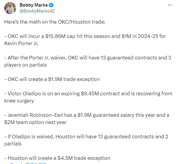 NBA薪资专家Bobby Marks撰文分析了雷霆和火箭在此交易后的合同情况: