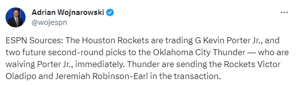 火箭把小凯文-波特、2027年二轮签(来自森林狼)和2028年次轮签(来自雄鹿)送到雷霆,得到奥拉迪波和杰雷米-罗宾逊-厄尔