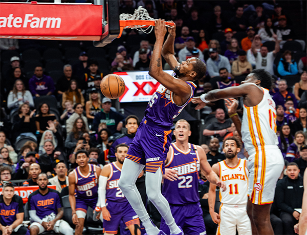 末节太阳又领先到两位数,面对老鹰的反扑,杜兰特轰进三分,琼斯也轰进三分,4分03秒太阳117-105领先12分;暂停回来,杜兰特助攻阿伦命中三分,太阳哑火,老鹰一波10-0打回悬念,杜兰特关键传球,35.6秒阿伦制胜一击,比尔抢断杀死比赛,布克罚球锁定胜局,最终太阳主场拿下胜利。