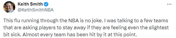 如今洛杉矶比赛恢复,NBA又遭流感侵袭,据名记Keith Smith报道,发推写道:目前席卷NBA的流感可不是闹着玩的,我和几支球队聊过,他们要求球员只要感觉身体有一点点不适就不要参加比赛;目前几乎每支球队都受到了流感的侵袭。