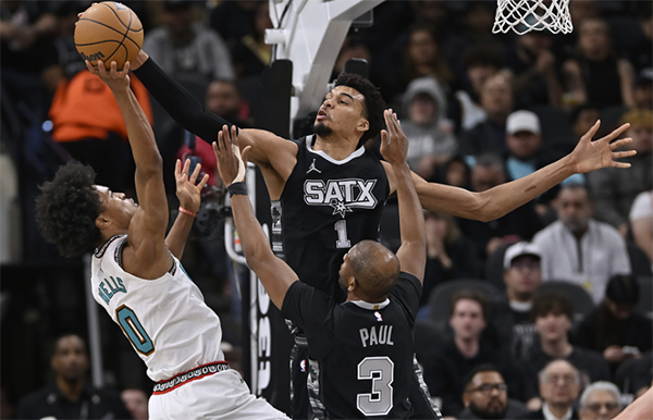 主场大战灰熊,马刺2-10开场落后,期间文班亚马惨遭伊迪隔扣;之后马刺反扑追分,文班外线开张,马刺一波12-4扳平比分,而且马刺后来居上,第一节30-28领先2分;文班首节5投2中拿到5分4篮板4盖帽,正面大帽威尔斯,顶板大帽小杰克逊,更是短短10秒连帽伊迪和阿尔达马。