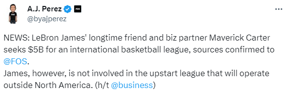 消息人士透露,卡特正在带头筹集50亿美元来组建一个新的联盟,但詹姆斯不是其中的一员。