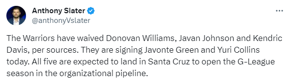 勇士随队记者Anthony Slater进一步报道,勇士已经裁掉戴维斯、约翰逊和威廉姆斯,他们将在今天签约贾文特-格林和尤瑞-柯林斯。这五名球员预计会加入勇士的发展联盟球队,为圣克鲁兹勇士效力。