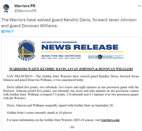 勇士官宣3裁2签!连续操作调整大名单 库里领衔豪阵冲击总冠军
