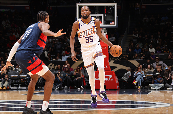第二节太阳领先15分后出现断电的情况,奇才一波11-2追到6分,随后格雷森-连得5分稳住局面,邓恩输送火力,阿伦再中三分,邓恩又连得7分,杜兰特稳稳拿下2分助太阳领先到20分,可之后太阳连续失误,被奇才打出11-0攻势,杜兰特得分止血,布克轰进三分,半场打完太阳69-55领先14分。