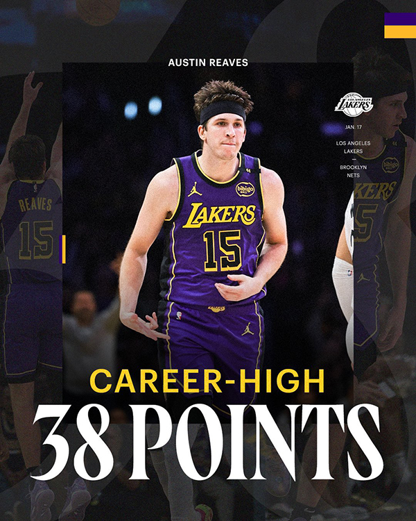 本场比赛,里夫斯23投13中,三分8中4,罚球8中8,砍下生涯新高的38分,另有3篮板3助2抢断1盖帽;里夫斯末节独砍15分,成为湖人赢球的大功臣之一。