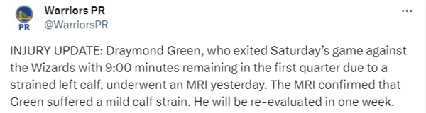 追梦格林的伤势如何?勇士官方更新伤情,追梦昨天接受了核磁共振检查,遭遇左小腿轻微拉伤,将在一周后复查;追梦至少伤停一周,他将至少缺席接下来勇士对阵凯尔特人、国王、公牛和湖人的四场比赛。