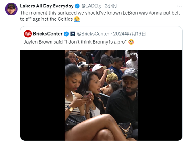 对于詹姆斯在湖凯大战中的表现,湖人媒体转发昔日杰伦-布朗说布朗尼不是职业球员的言论,配文写道:当这件事浮出水面时,我们就应该知道勒布朗将在对阵凯尔特人的比赛中大放异彩。