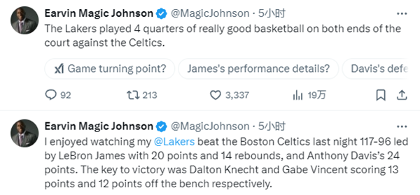 湖人名宿魔术师约翰逊发推庆祝大胜绿军,发推写道:我很高兴看到我的湖人队21分大胜凯尔特人,詹姆斯拿到20分14篮板,浓眉拿到24分,胜利的关键是替补出场的克内克特和文森特分别拿下13分和12分;湖人队在攻防两端都打出了非常精彩的四节比赛。