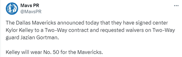 来源:JRS直播网01-27 11:06JRS直播网讯 北京时间1月27日,由于遭遇伤病打击,独行侠官方宣布一裁一签,裁掉双向合同后卫贾齐安-戈特曼,然后用双向合同签约中锋凯勒-凯利,后者将身穿独行侠50号球衣。