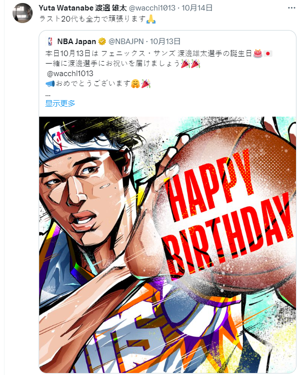 此前渡边雄太还转发NBA官方的祝贺,配文写道:我会在我20几岁的末期拼尽全力。