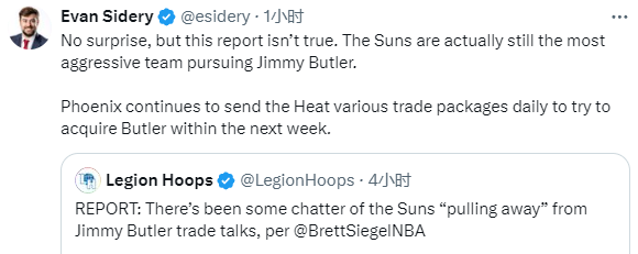 Evan Sidery则表示太阳退出巴特勒争夺战的报道不真实,实际上太阳队仍然是追逐吉米-巴特勒最积极的球队。 太阳每天都继续向热火队发送各种交易报价,试图在下周内获得巴特勒。