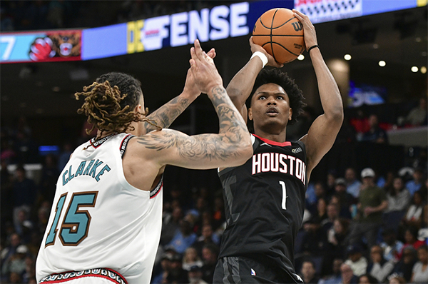 西部第二和西部第三之间的关键卡位战,申京和莫兰特双双缺席比赛,第一节火箭多点开花,首节38-33领先灰熊5分,狄龙战旧主手感火热,首节6投4中、三分3中2贡献10分,杰伦-格林5中3拿到9分2助攻,阿门送出精彩的钉板大帽。