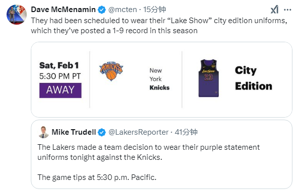 来源:JRS直播网02-02 17:29JRS直播网讯 北京时间2月2日,NBA常规赛湖人客场大战尼克斯,赛前湖人决定更换球衣,据湖人记者Dave McMenamin和Mike Trudell报道,湖人原计划身穿城市版球衣对阵尼克斯,但赛前湖人决定身穿紫色球衣,不穿“LakeShow”城市版球衣。