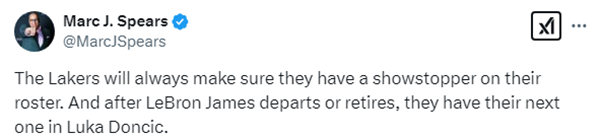 名记Marc J. Spears透露,湖人想始终确保阵容有一个超级球星,詹姆斯退役后,他们的下一个超级巨星就是东契奇;浓眉很乐意加盟独行侠,他和独行侠总裁哈里森的关系很好。