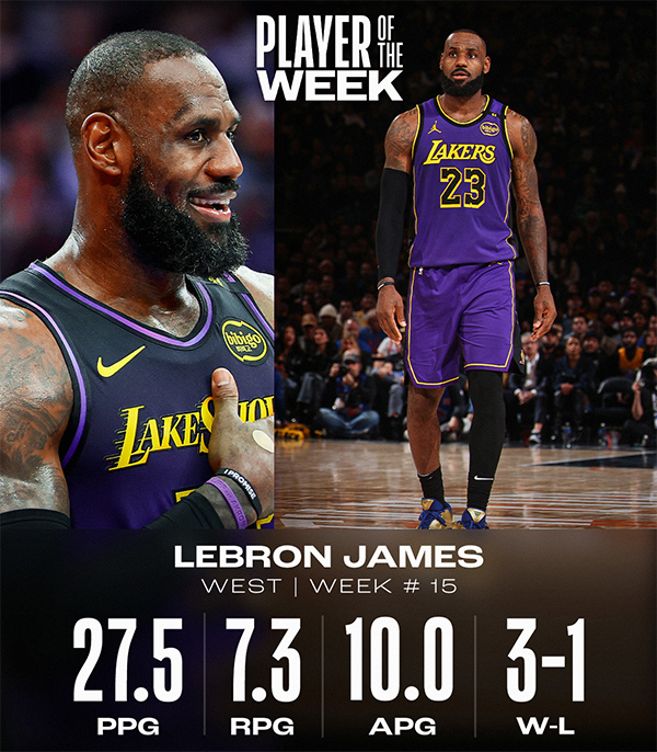 凭借出色的表现,詹姆斯力压西部众星荣获西部周最佳,连创多项纪录——