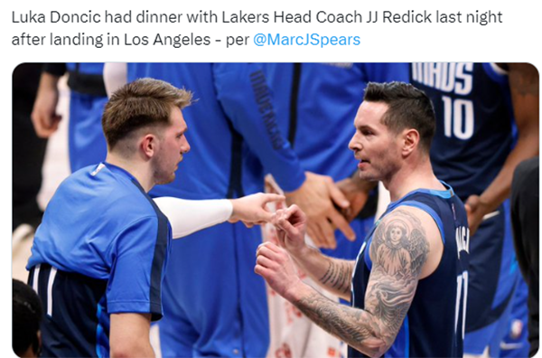 东契奇已经正式成为湖人队的一员,据报道,昨晚东契奇抵达洛杉矶与雷迪克共进晚餐,Brad Townsend报道,东契奇今天大部分时间都在湖人训练馆中。